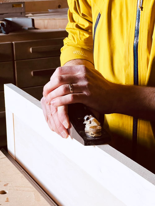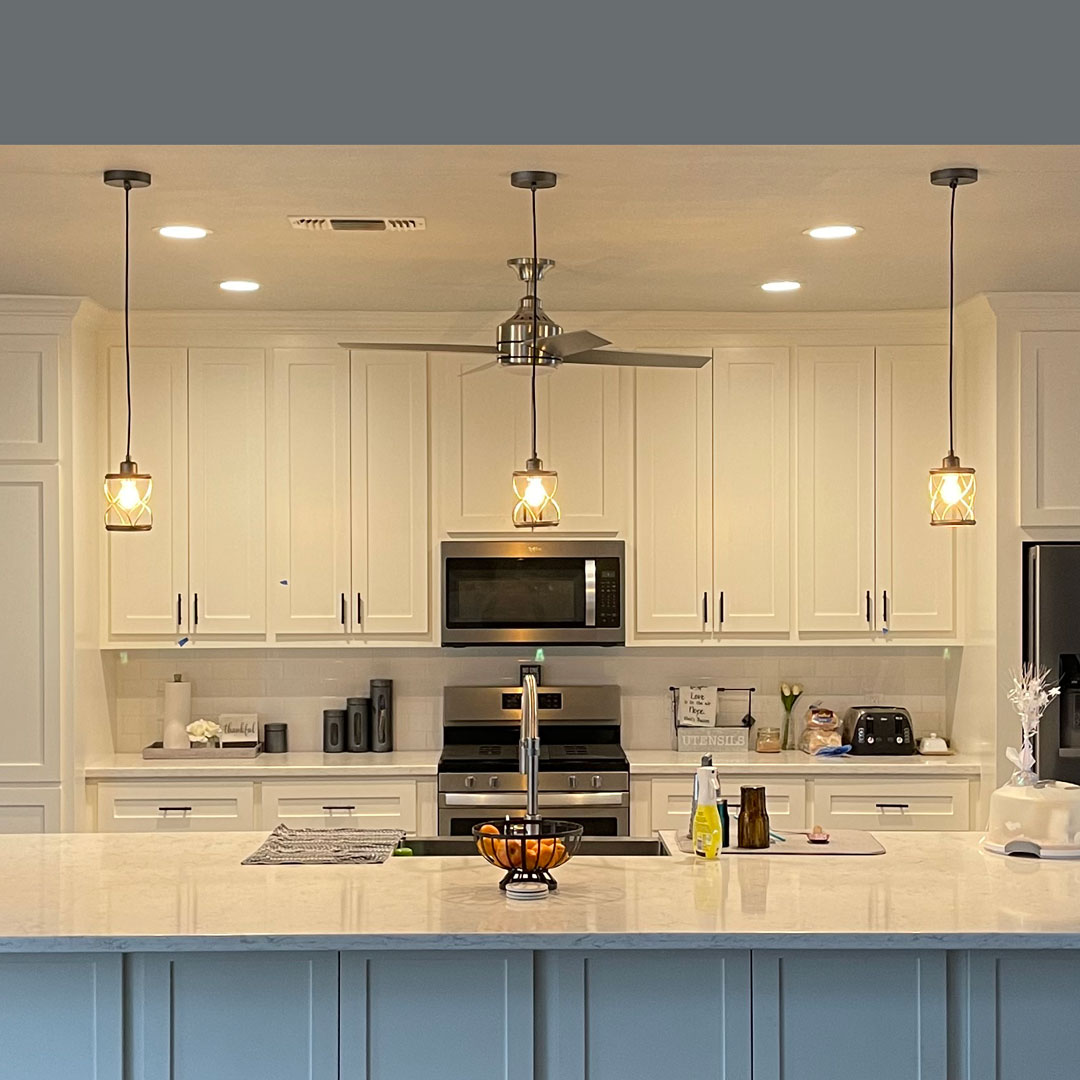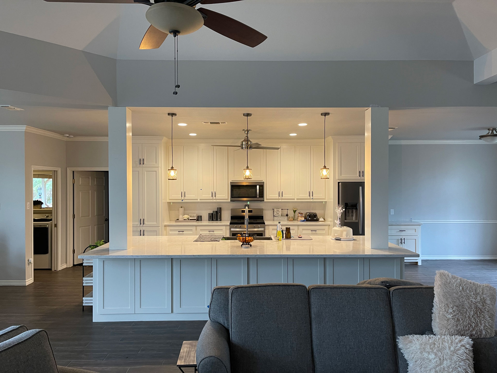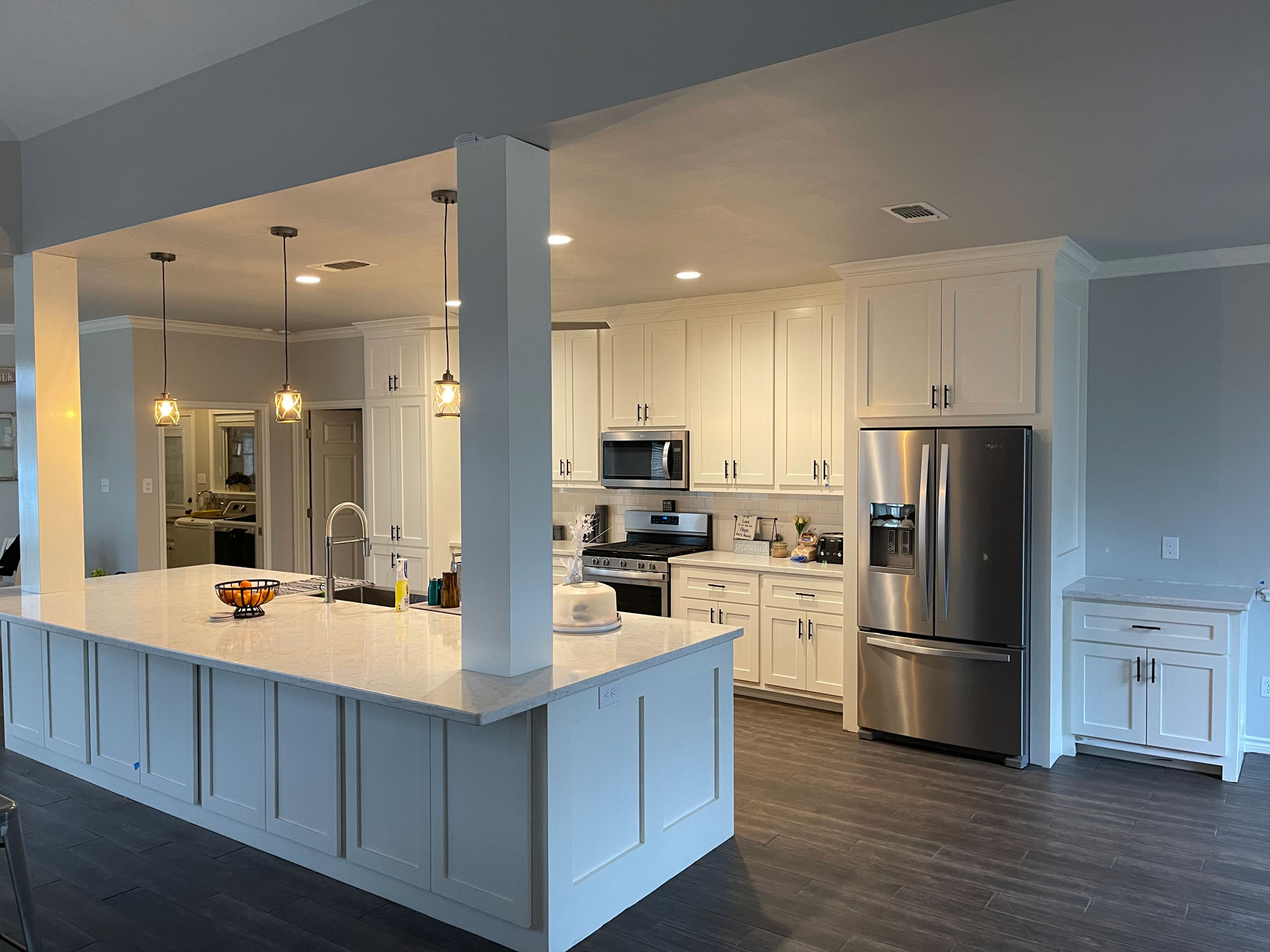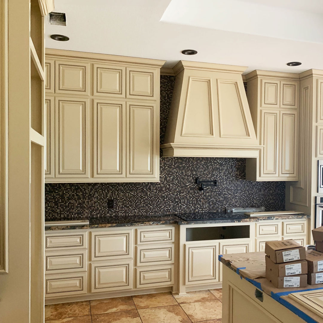 One of our larger projects showcasing an elegant beaded cabinetry full width overlay designed and hand crafted for a clients kitchen cabinets, tall pantry cabinets, and a large walk-in closet. Our team also created and installed the trim for the windows, wall skirts, the two spacious bookcases, as well as the incredible rafters & paneled woodwork on the ceiling.