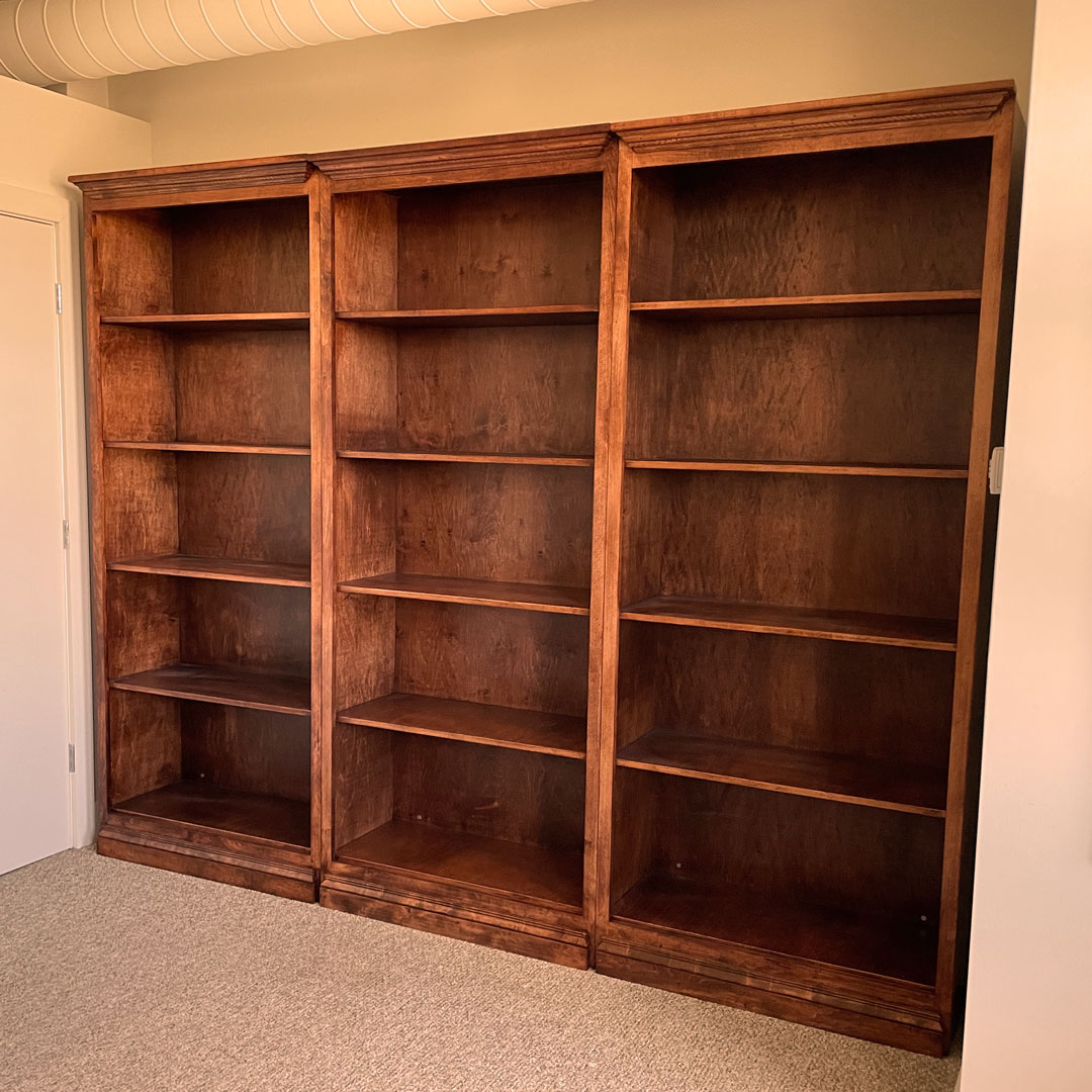 A custom-built traditional bookcase in rich, dark wood finish offers both elegance and expansive storage, making it a timeless addition to any personal library or office space.