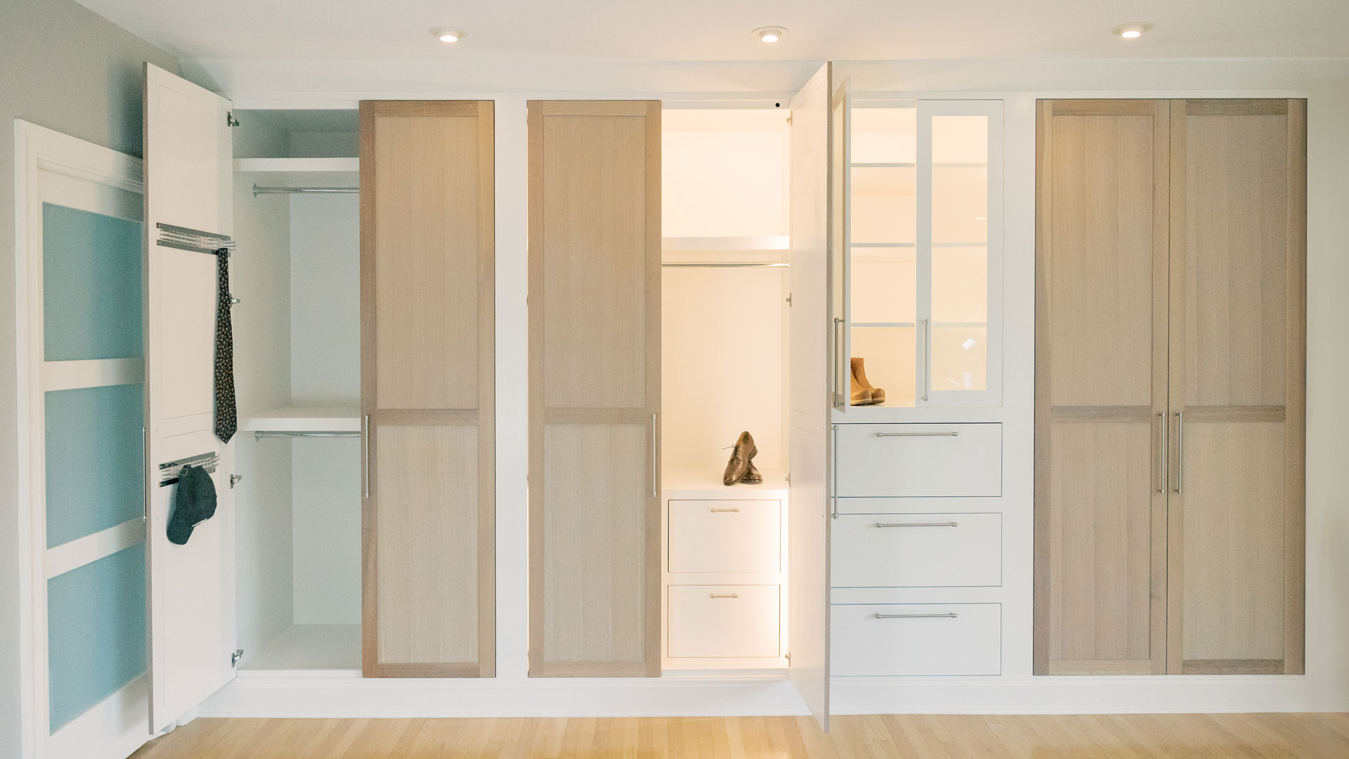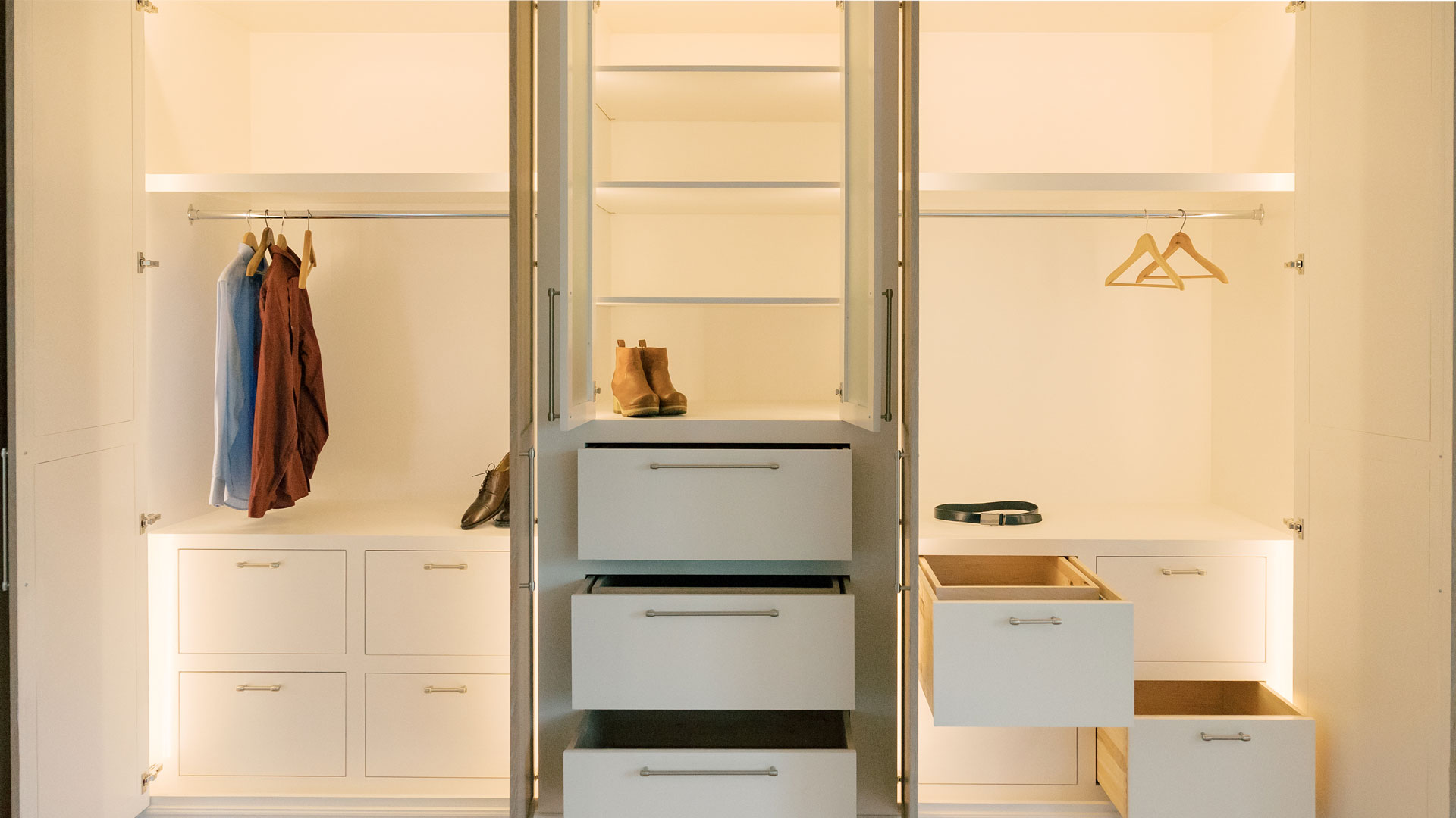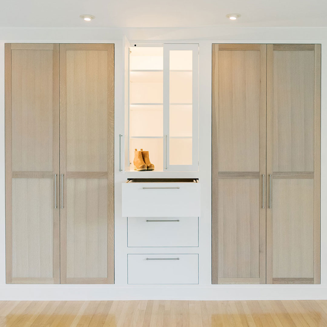 Our latest project is a sleek, modern custom closet, designed with premium hardwoods and featuring adjustable shelving, soft-close drawers, and integrated LED lighting.