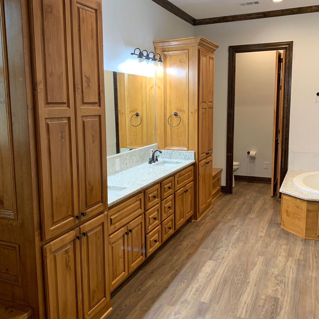 A custom traditional vanity showcases expertly crafted natural wood cabinetry with a classic design, providing a sophisticated and functional centerpiece for the refined bathroom providing plenty of storage.